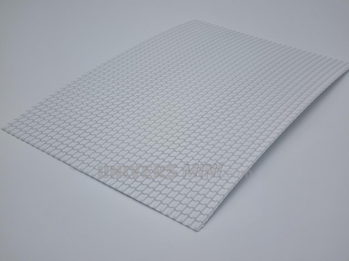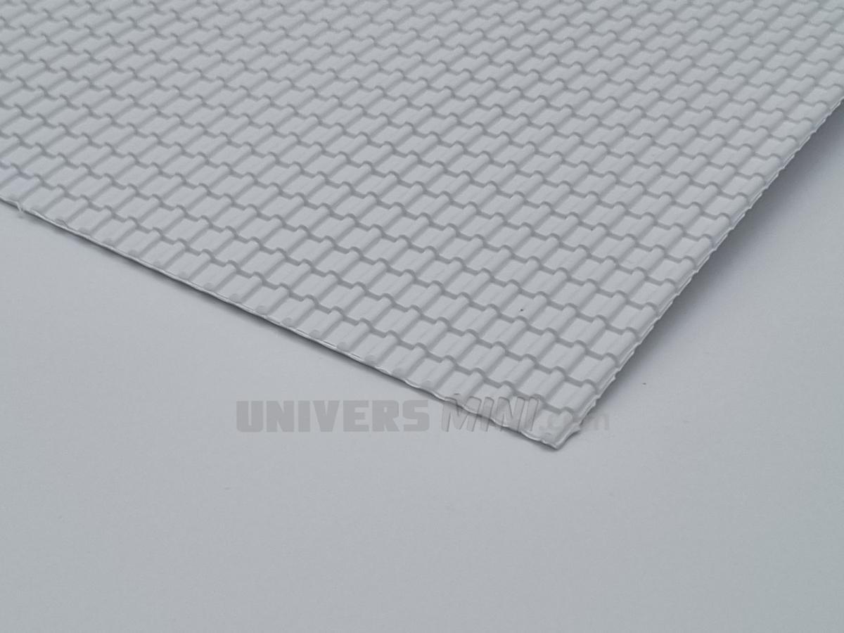 1 plaque styrène imitation tuiles. 200x300x2.5mm. Une tuile mesure 2.5x7mm. Se coupe très facilement à l'aide de ciseaux.