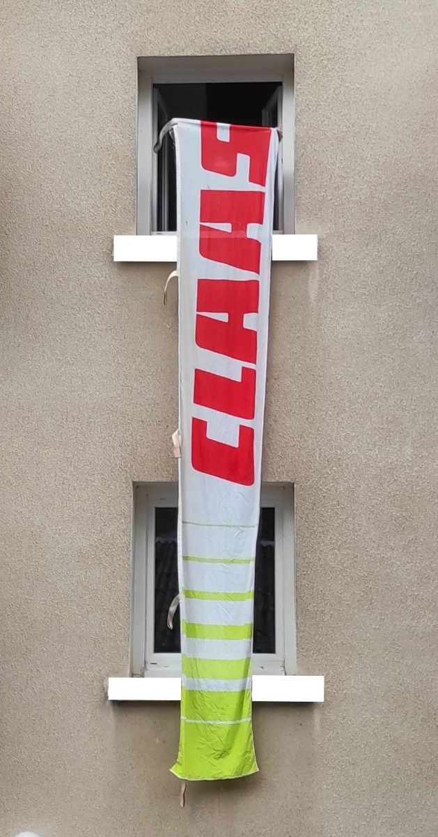 Très grand drapeau CLAAS d'occasion, en bon état malgré des traces d'utilisation sur mat de concessionnaire. Idéal décoration.