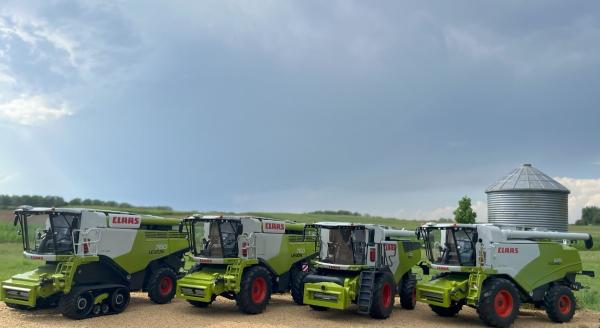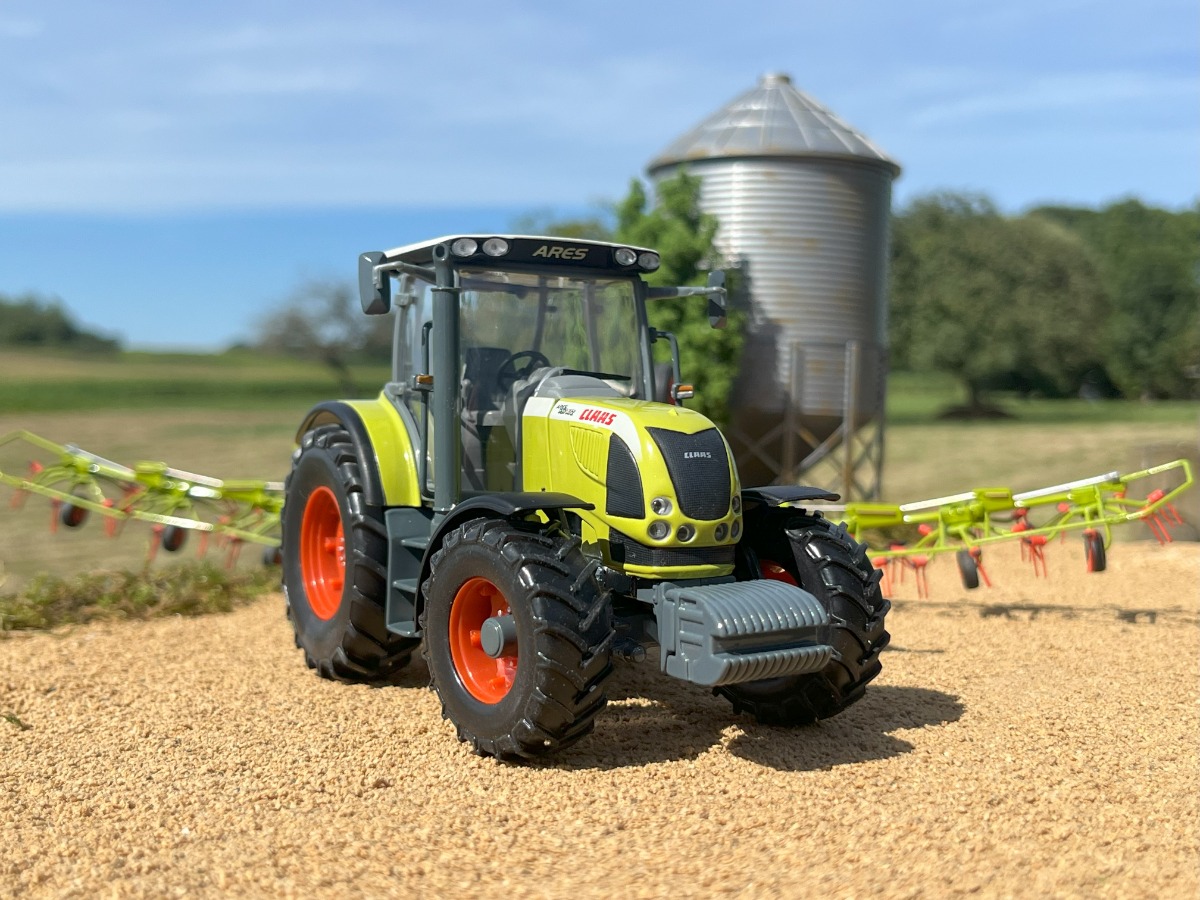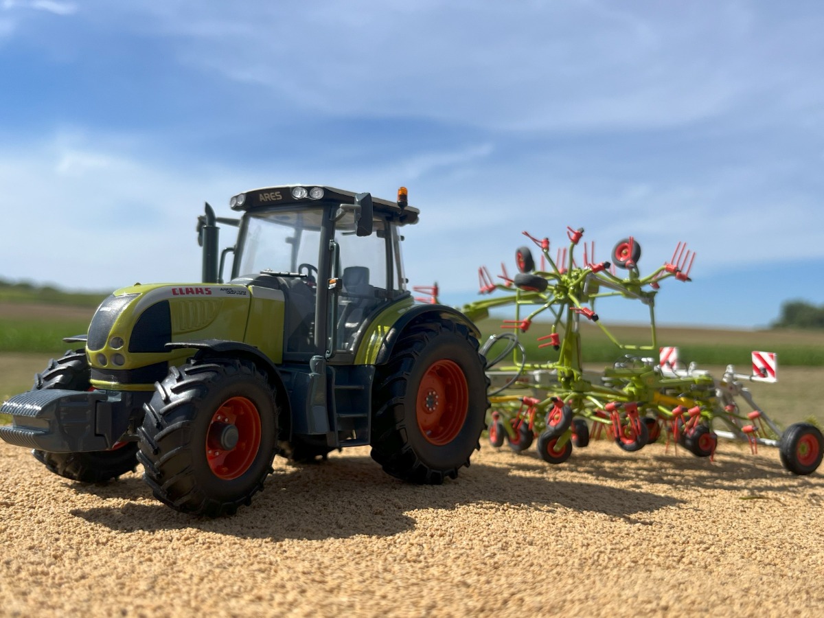 Sous un autre angle, CLAAS ARES 657ATZ et sa faneuse CLAAS VOLTO